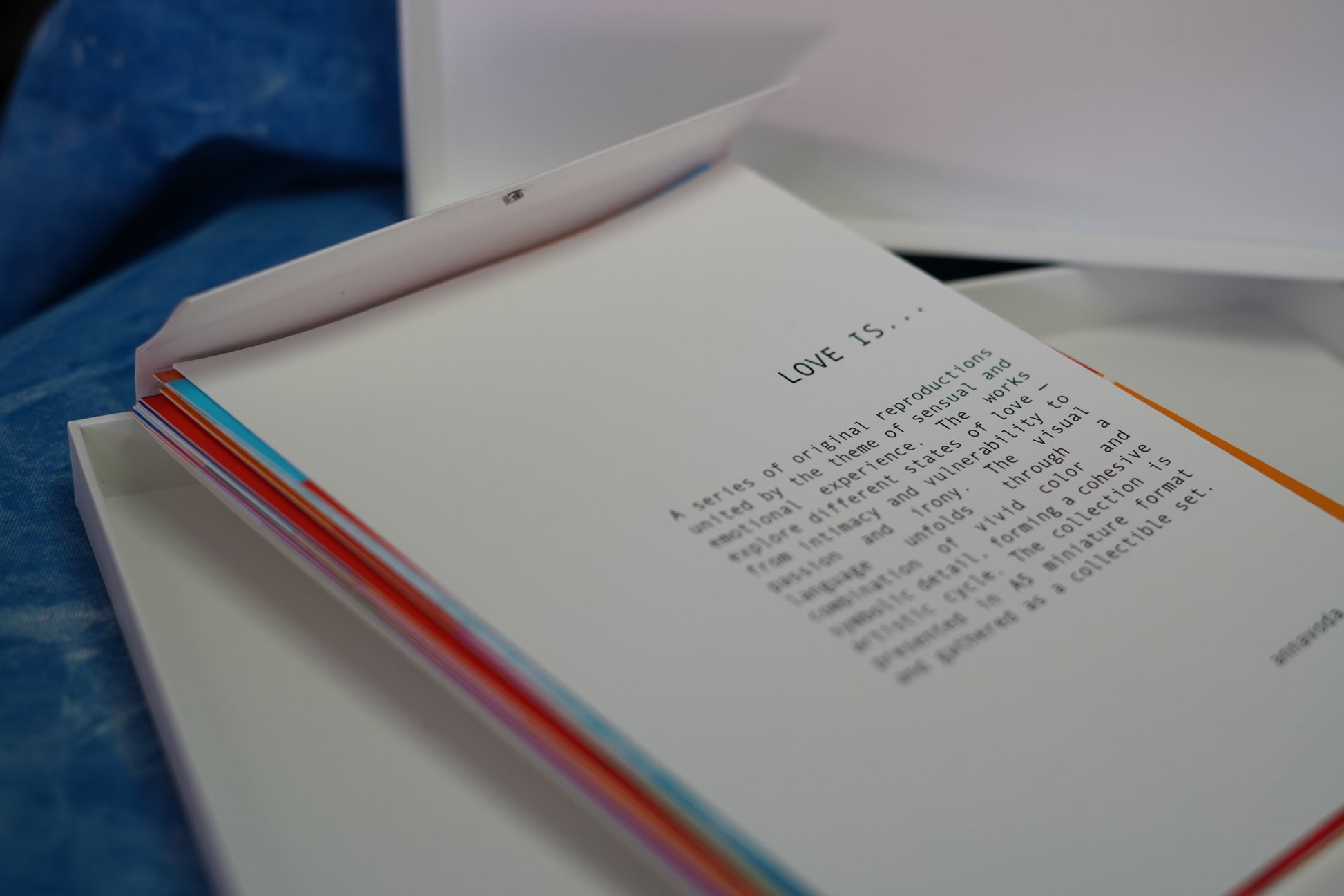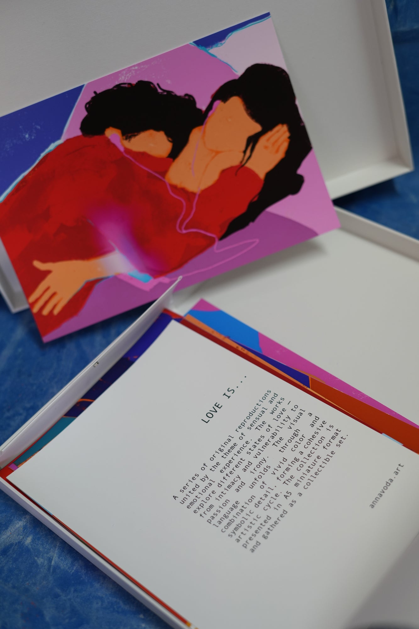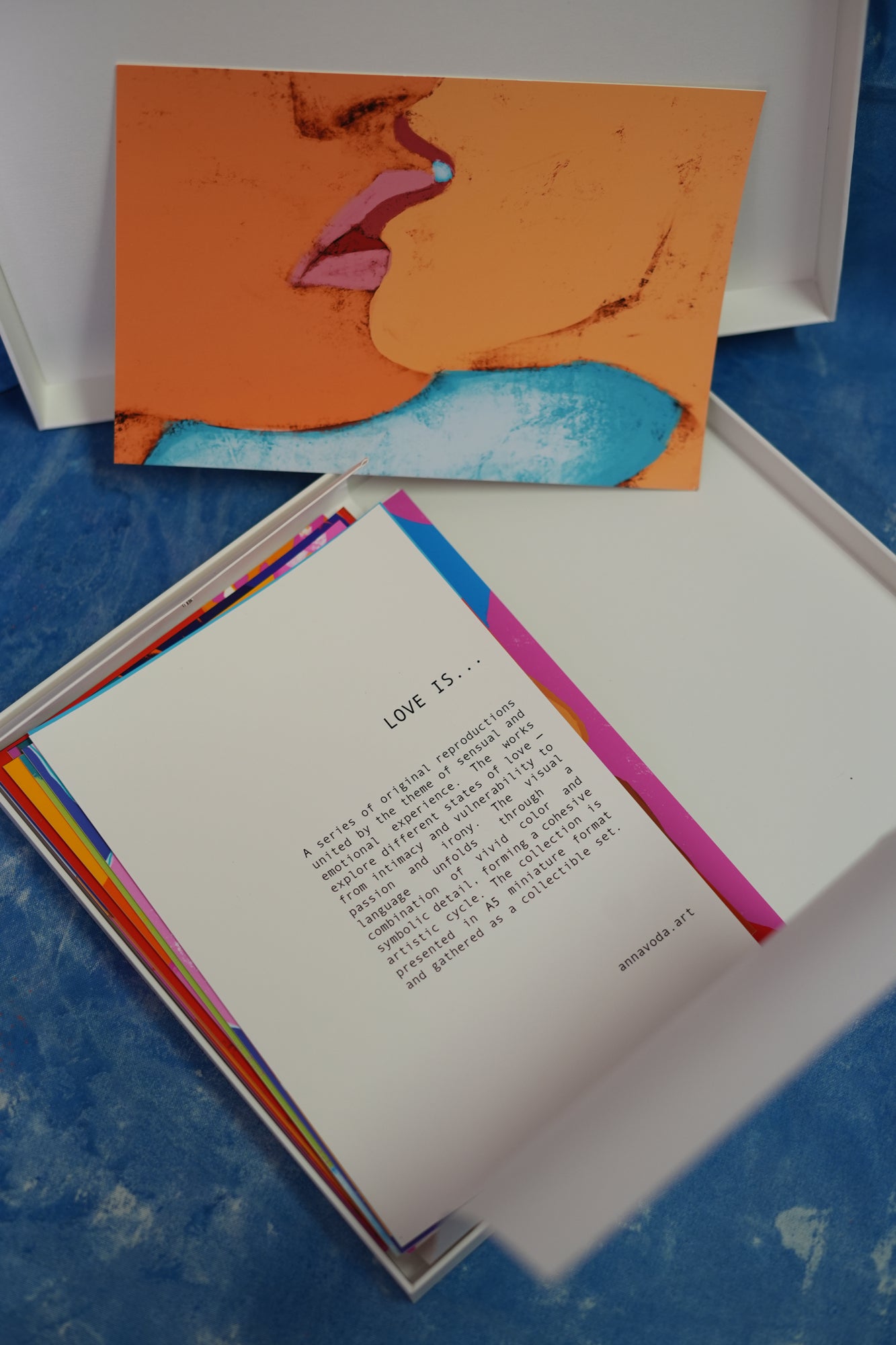 LOVE IS… — a series of 20 original reproductions united by the theme of sensual and emotional experience. The works explore different states of love — from intimacy and vulnerability to passion and irony. The visual language unfolds through a combination of vivid color and symbolic detail, forming a cohesive artistic cycle. The collection is presented in A5 miniature format and gathered as a collectible set.